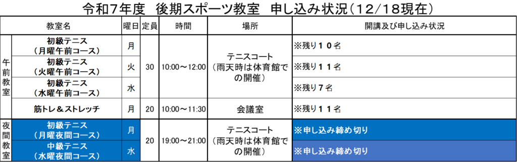 ※月曜夜間初級テニスと水曜夜間中級テニス教室へ期日までにお申し込みの方は全員受講いただけます。