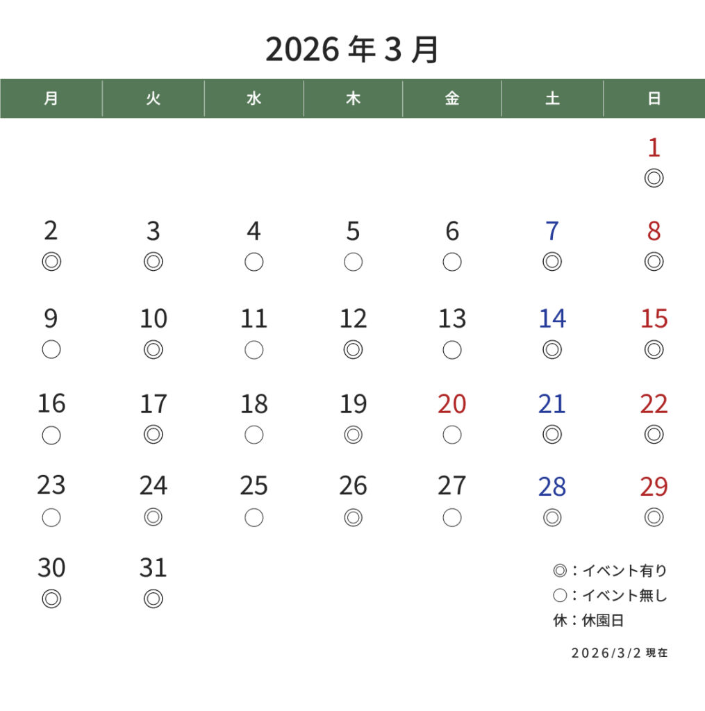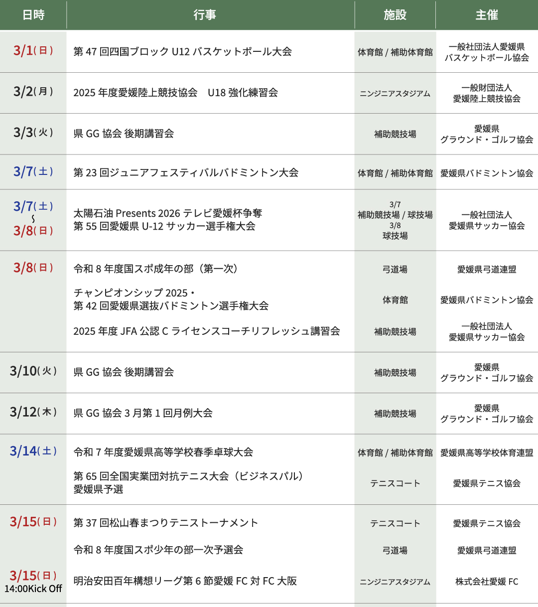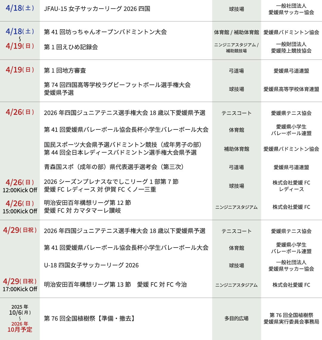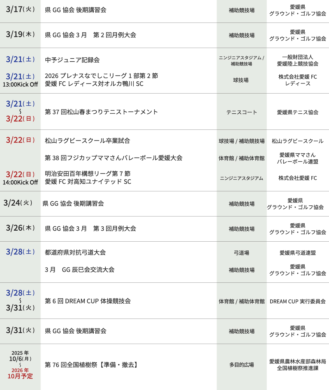 【施設情報】施設利用状況カレンダー 投稿日 2026-03-02 著者 tobemori カテゴリー 総合運動公園 利用状況をご確認の上、ご利用ください。 =TOBEMORI SEEDS サポートセンター= E-mail:support@tobemori-seeds.com TEL:089-900-0870 (8:30~21:00) ※17:30以降は電話が大変繋がりづらくなります。