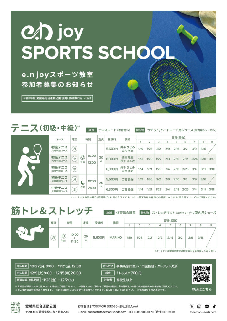 R7年度 後期e.n joy スポーツ教室について 投稿日 2026-02-13 著者 tobemori カテゴリー e.n joyスポーツ教室 午前開催の全テニス教室及び筋トレ&ストレッチ教室については空きがございます。 先着順での受付をしておりますので、お気軽にお申し込みください。 令和7年度(後期)愛媛県総合運動公園 スポーツ教室応募フォーム スポーツ教室のお申し込み