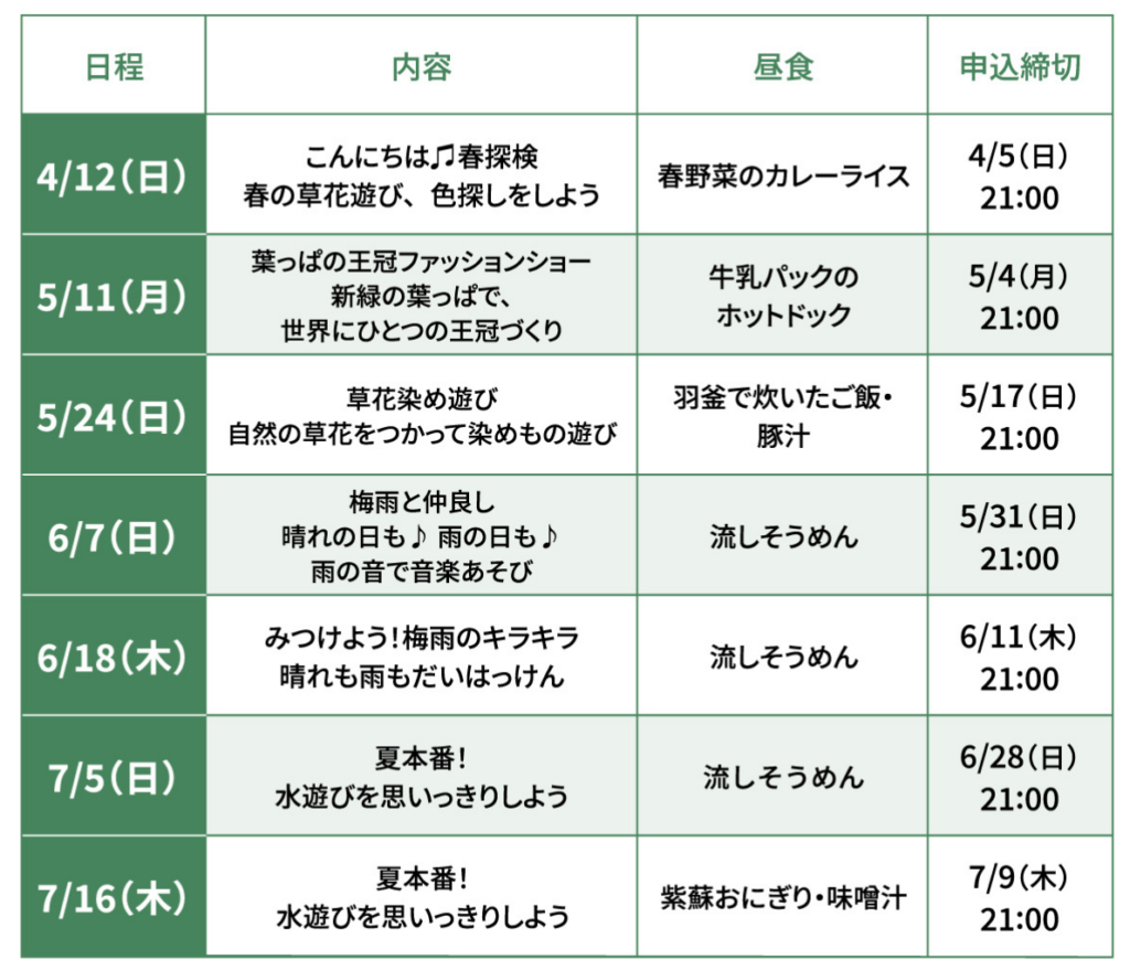 季節の草花探しや水あそび、葉っぱの王冠づくりなど、その時期ならではの活動も盛りだくさん。
