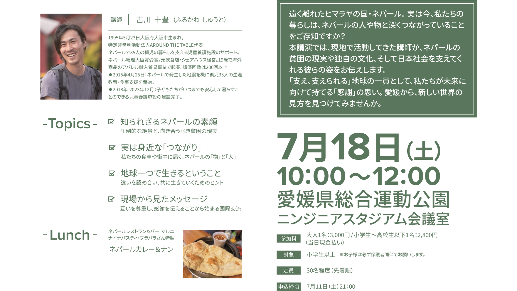 古川十豊さん講演会|地球一つで支え合う、日本とネパールの物語~ヒマラヤの麓から愛媛へ。感謝でつなぐ「心の架け橋」~ 投稿日 2026-04-21 著者 tobemori カテゴリー イベント カテゴリー 申込受付中 お申込みはコチラ アレルギーなどご心配ございましたら、お申し込みの際にご入力ください。(担当者から連絡する場合がございます。) お申込みはコチラ アレルギーなどご心配ございましたら、お申し込みの際にご入力ください。(担当者から連絡する場合がございます。)
